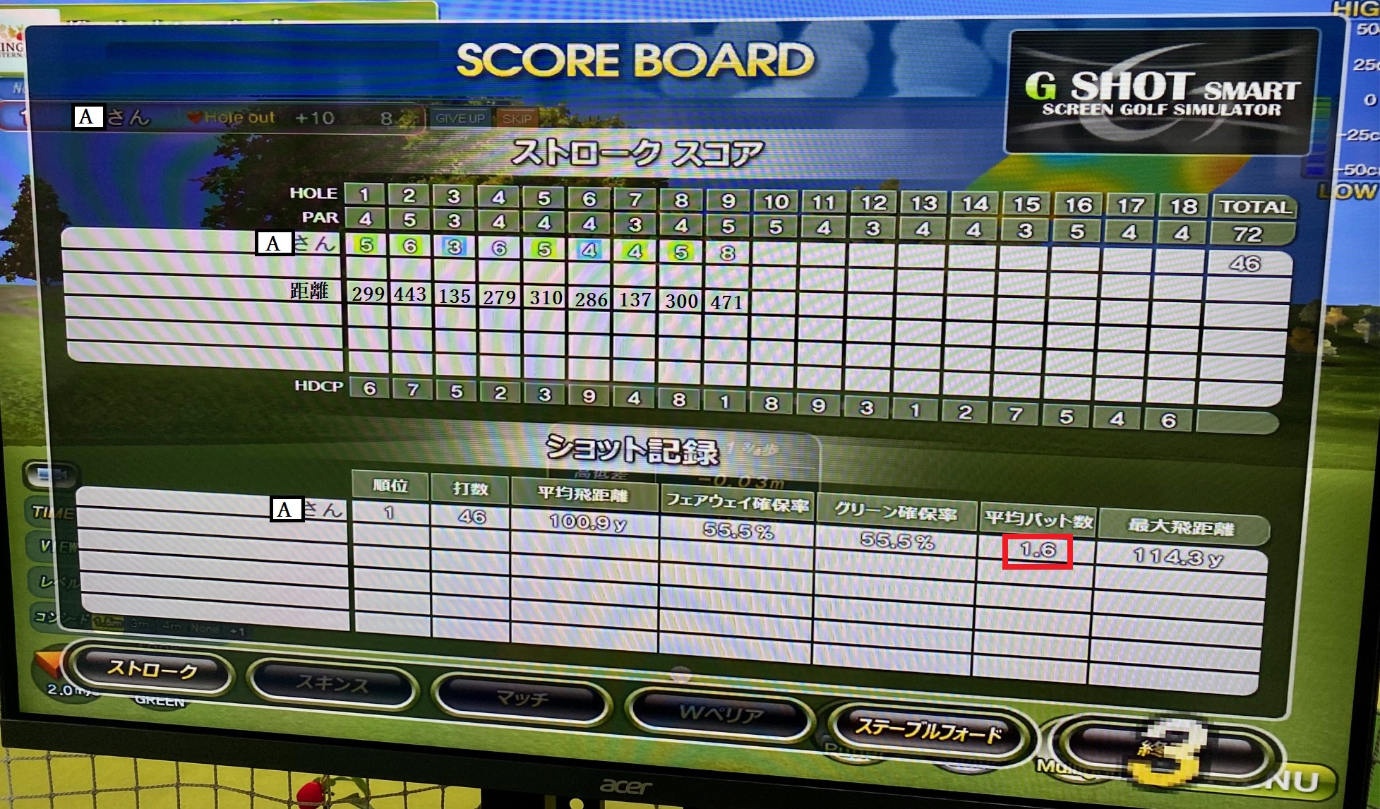 だから画像にある通り1ホール1,6パットという大変素晴らしい数字が出ています